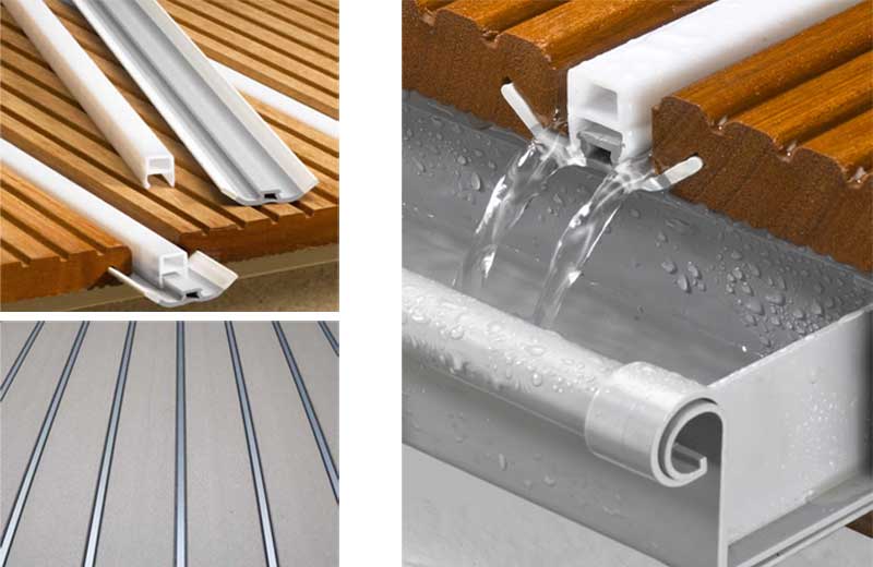 Das formstabile und witterungsbeständige Profil (der WING) wird auf die Unterkonstruktion geschraubt. Es greift in passgenaue Nuten der Dielen. So wird das Holz einerseits zuverlässig gehalten, behält aber andererseits einen gewissen Spielraum zum Quellen und Schwinden. Die Gefahr von Rissbildungen wird erheblich verringert. Das Profil hält die Holz-, WPC- oder Kunststoffdielen wie eine Schwalbenschwanz- Verbindung. Stück für Stück entsteht eine durchgehende, geschlossene Fläche. Danach wird das schlagfeste Oberprofil auf den WING geklickt. Es sorgt für eine plane Fläche zwischen den Dielen, schützt die Verschraubungen dauerhaft vor Wasser und kann optional mit Leuchtdioden bestückt werden.